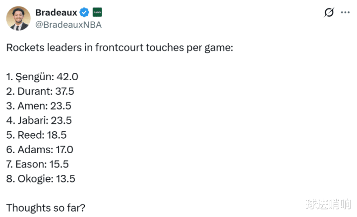开赛至今,小贾场均触球23.5次,相较上个赛季大幅提升,成功追平阿门并列火箭队第三,仅次于杜兰特37.5次和申京42次。
